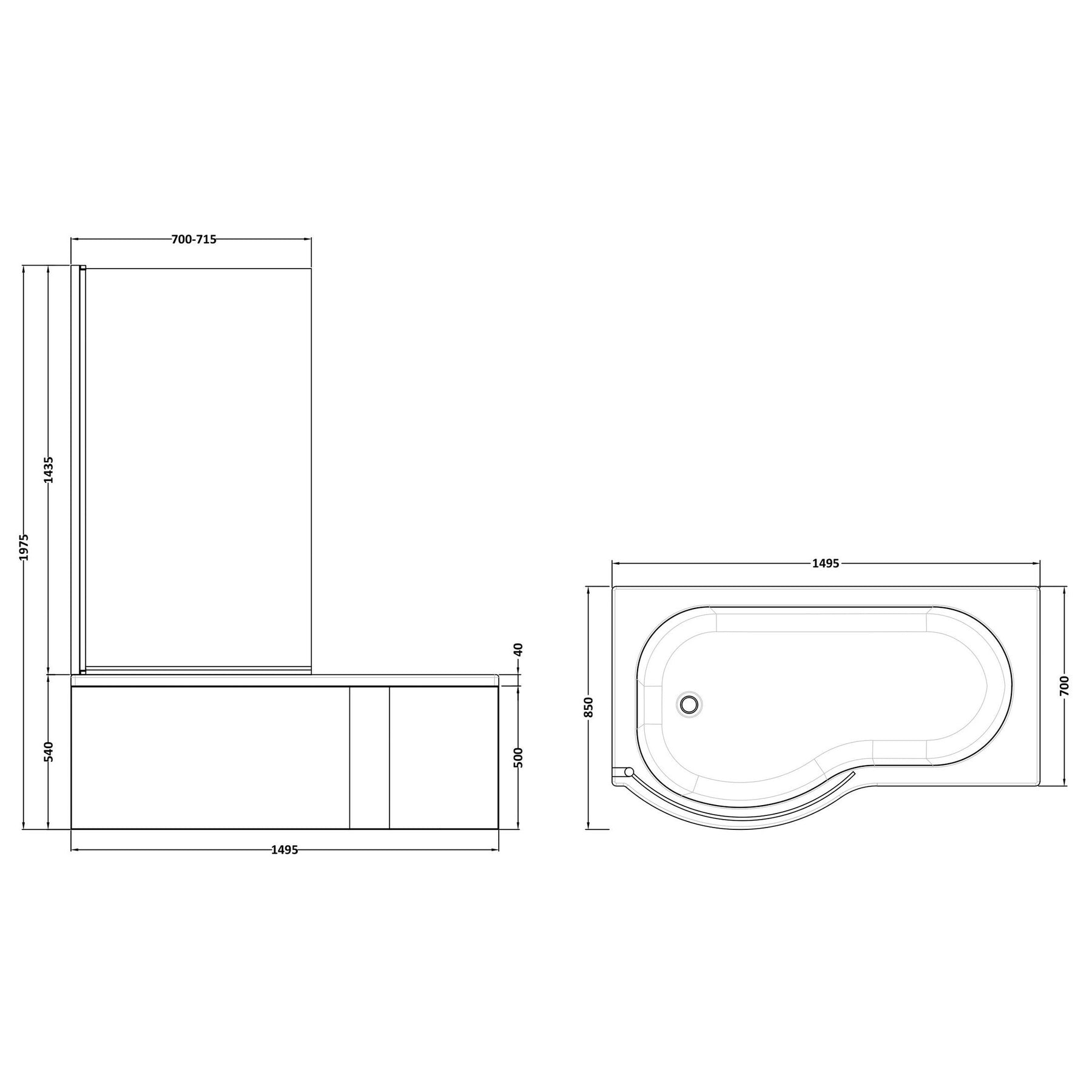 P-Shaped Shower Bath, Chrome Shower Screen & Panel - 1500mm x 850mm, Left Hand