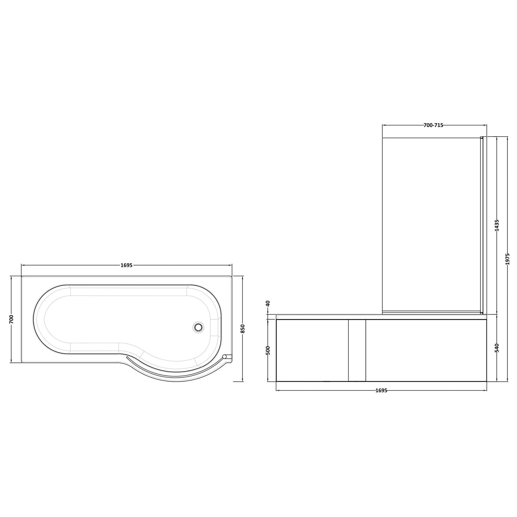 P-Shaped Shower Bath, Chrome Shower Screen & Panel - 1700mm x 850mm, Right Hand