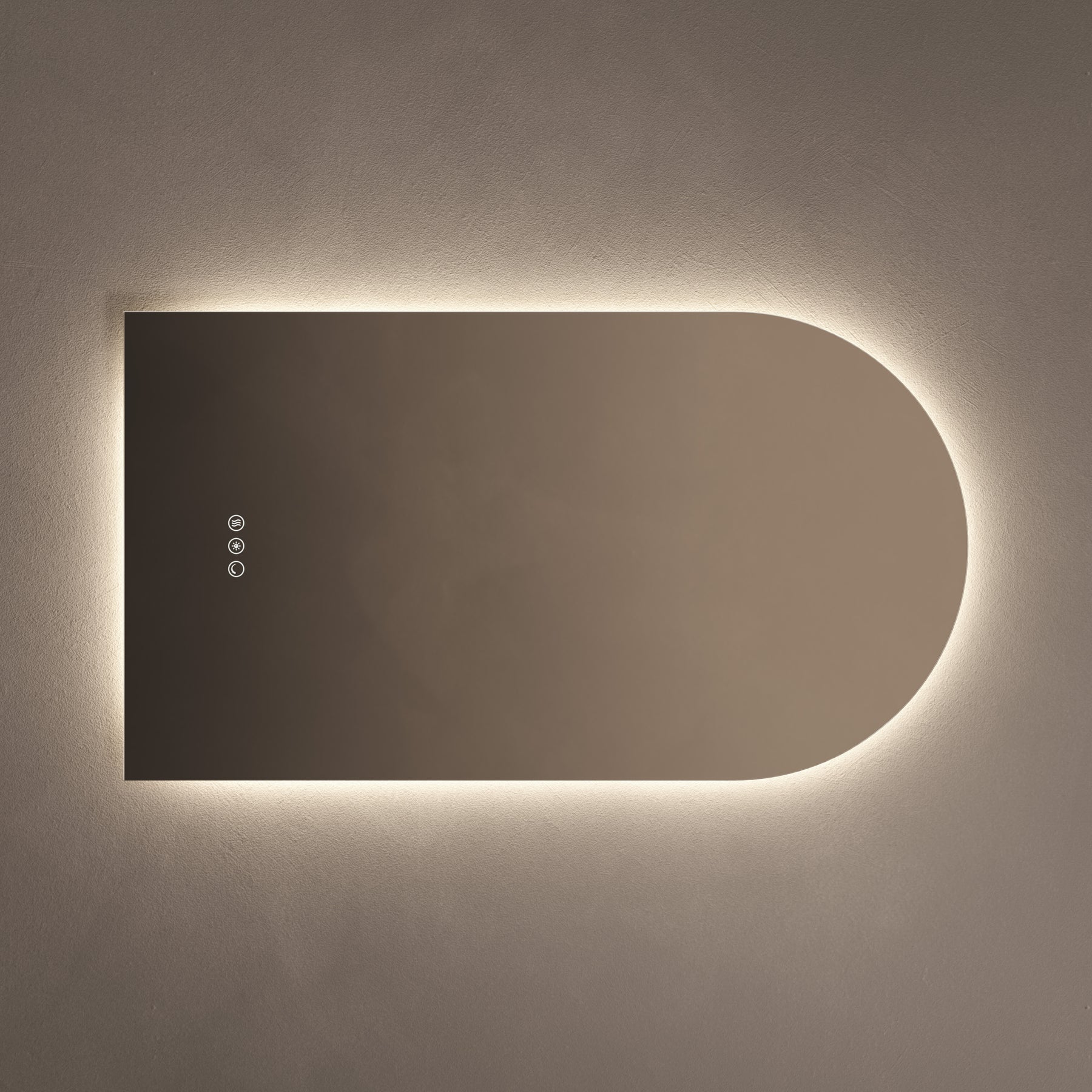 Close-up of touch sensor and demister feature on Claris Arch 50 x 90cm LED mirror - Origins Living mirror by BathLab