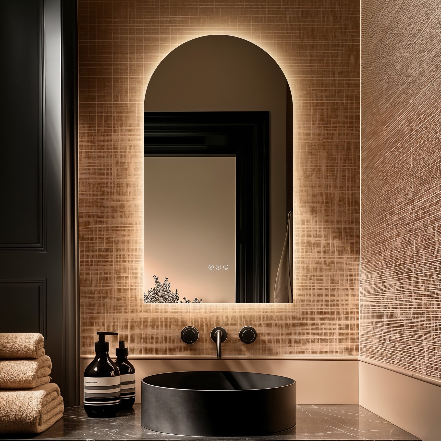 Claris Arch 50 x 90cm LED bathroom mirror with touch sensor and backlit frame, styled in a luxury bathroom with matt black tap and modern basin - Origins Living mirror at BathLab