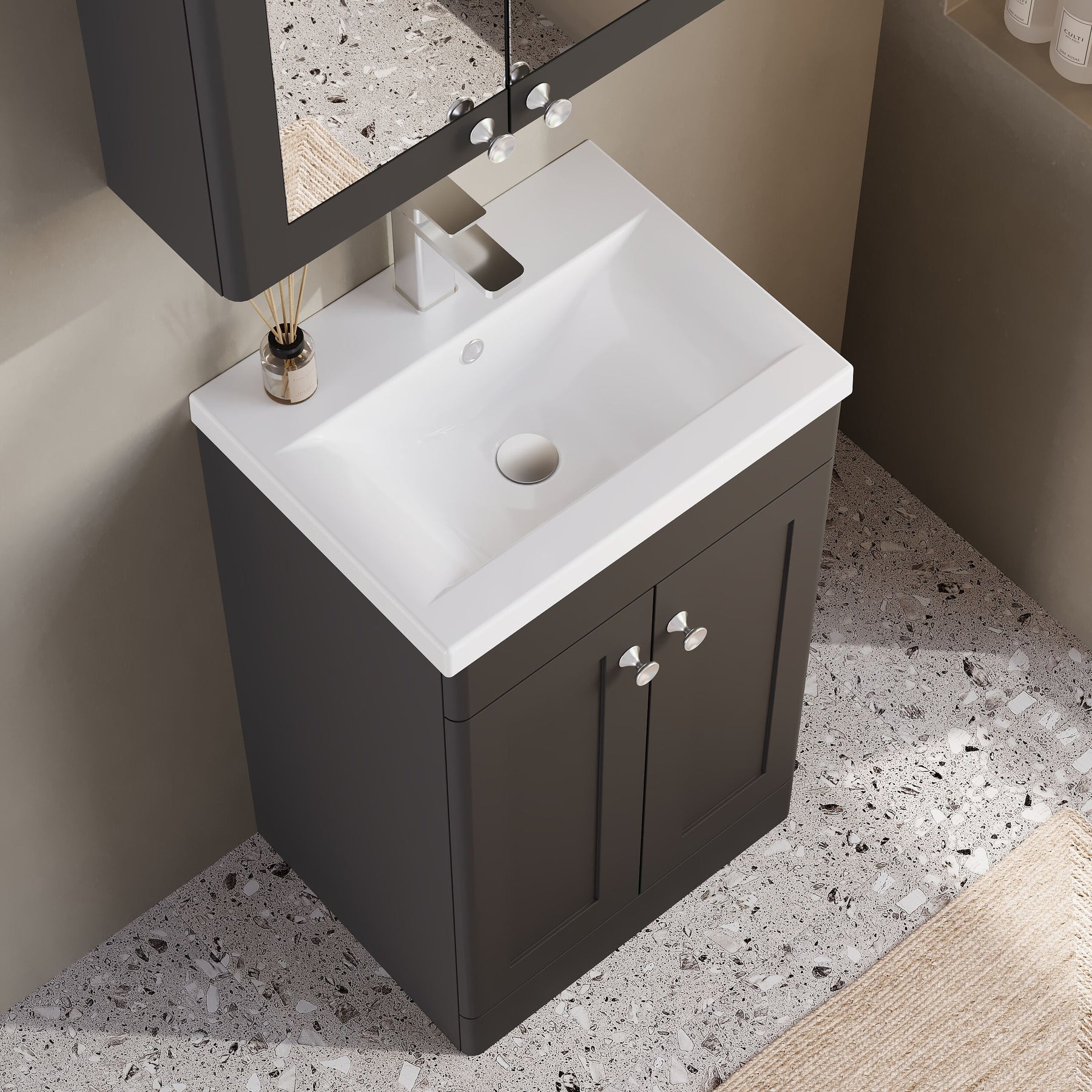 The Classique vanity unit comes with a modern Mid Edge ceramic basin which has a 40mm thick outer profile and deep 140mm bowl. The basin features 1 tap hole so is for use with standard sized monobloc basin mixer taps and has an overflow, so requires a slotted or universal waste.