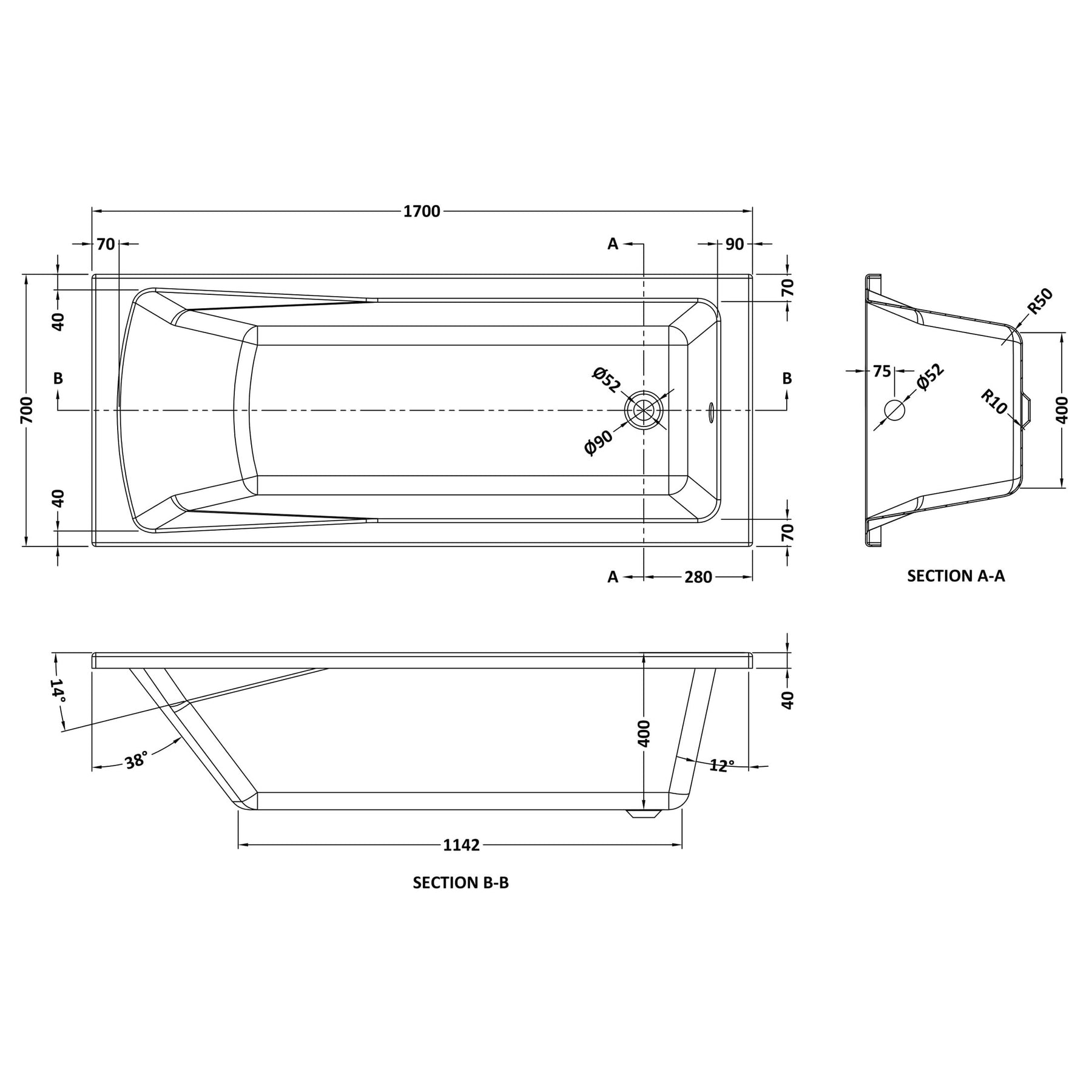Eternalite Reinforced Square Single Ended Bath - 1700 x 700mm