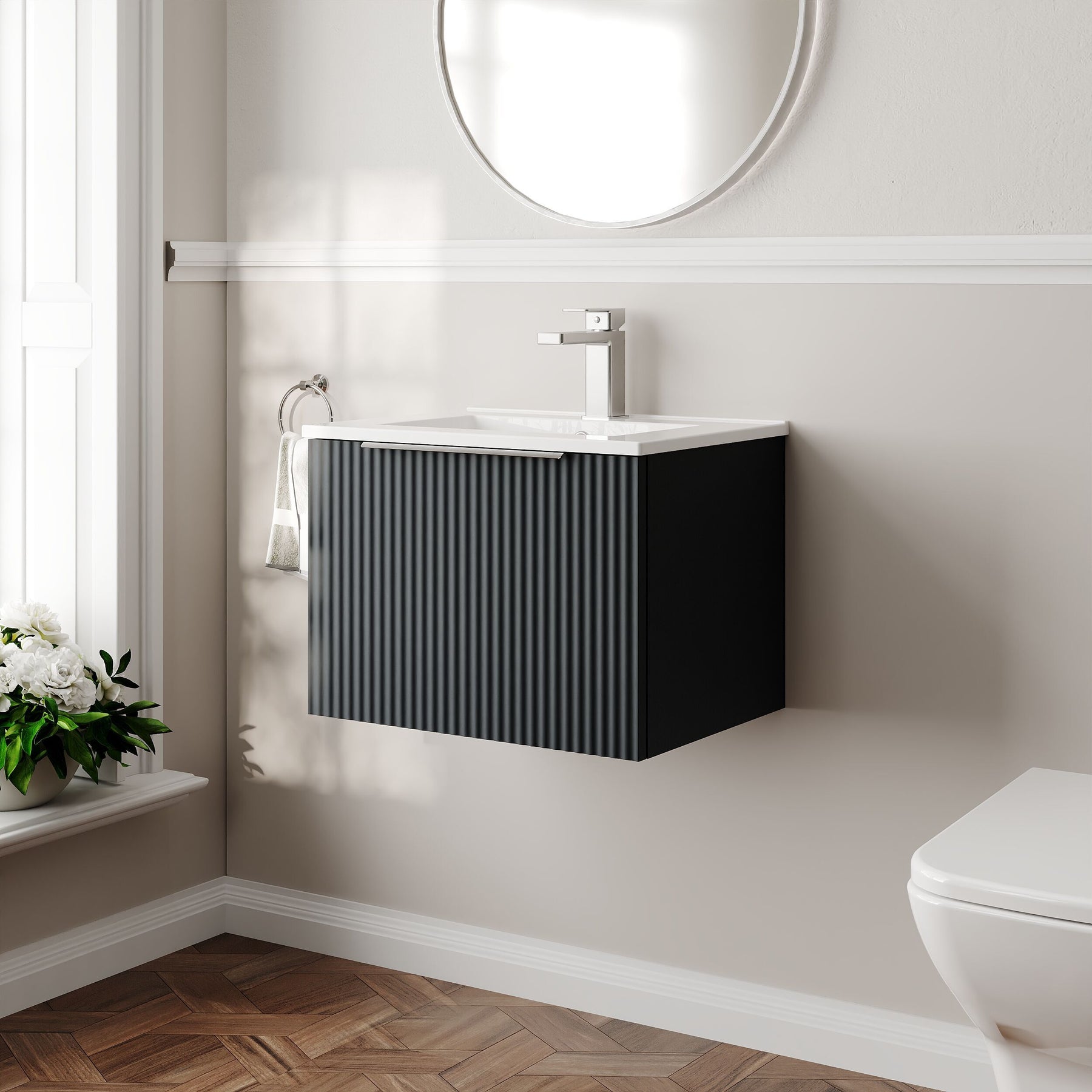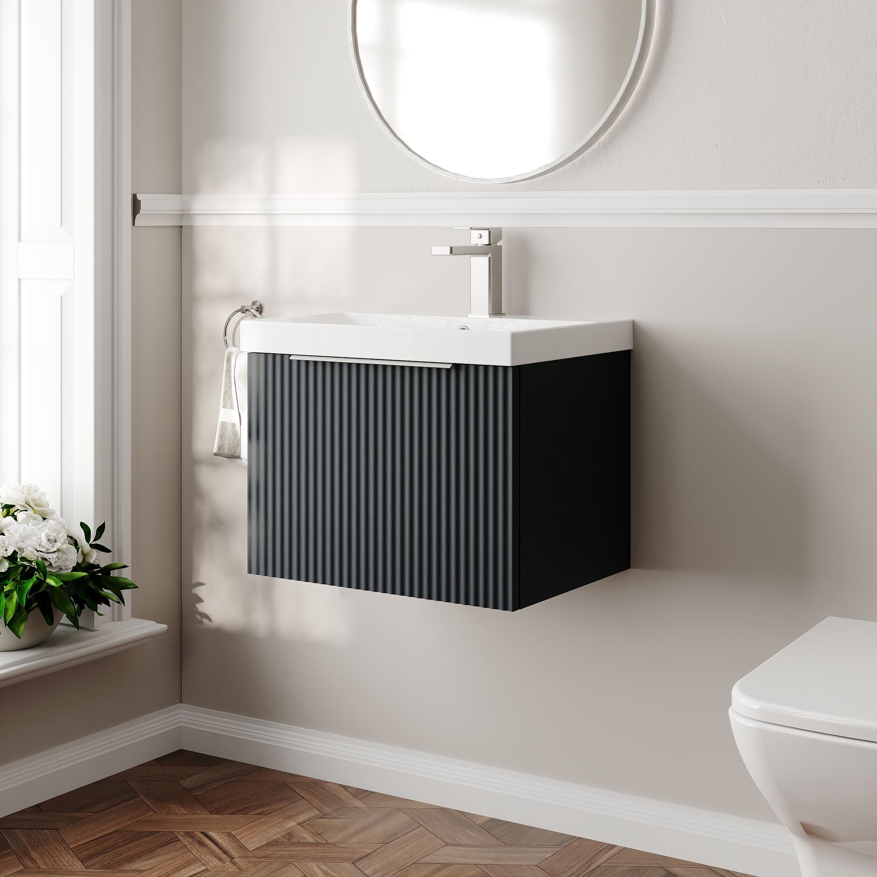 The Hudson Reed Fluted bathroom furniture collection features an on-trend fluted front and a choice of popular colours. The stylish Fluted vanity units and matching furniture include modern chrome handles that can be changed to alternative matt black or brushed brass handles.