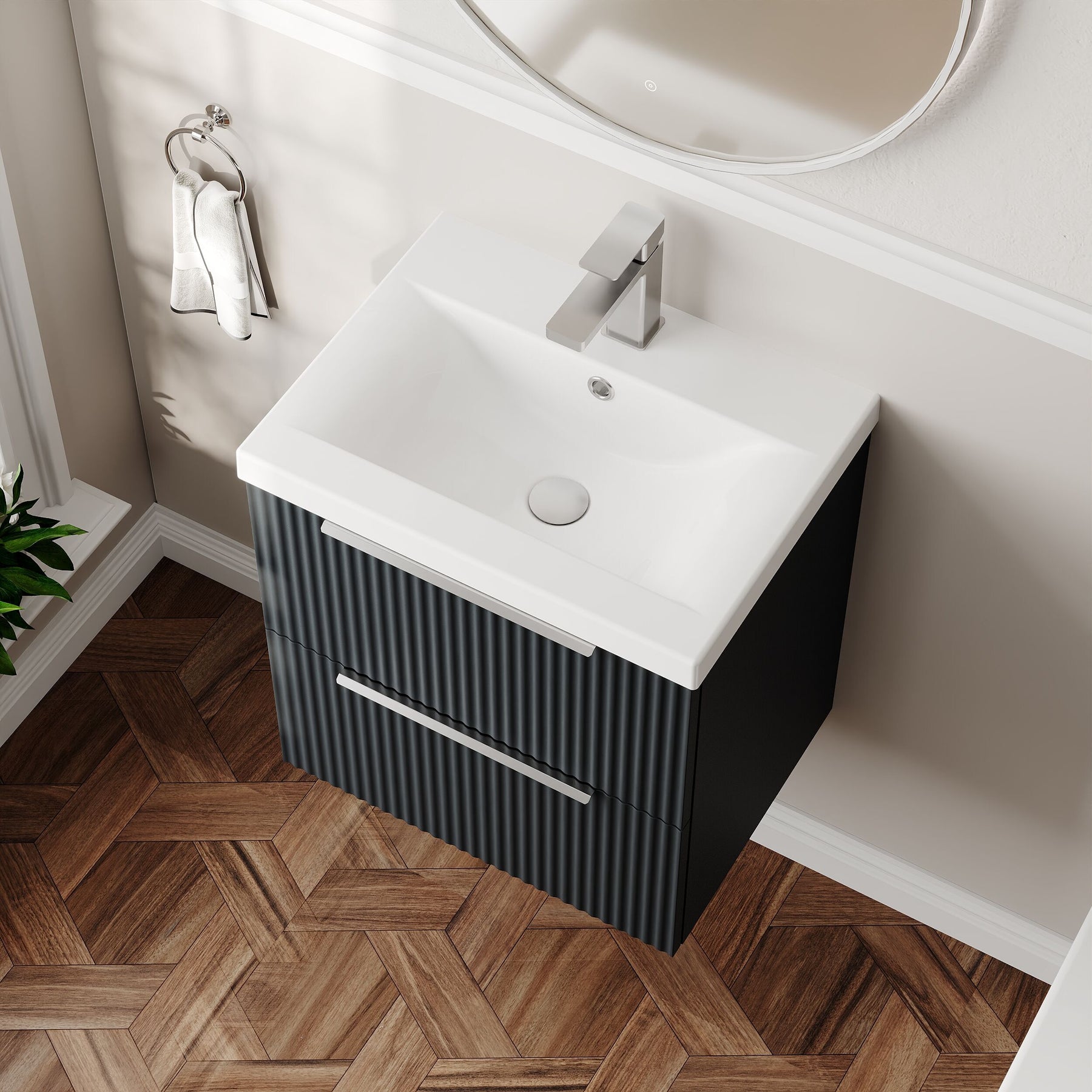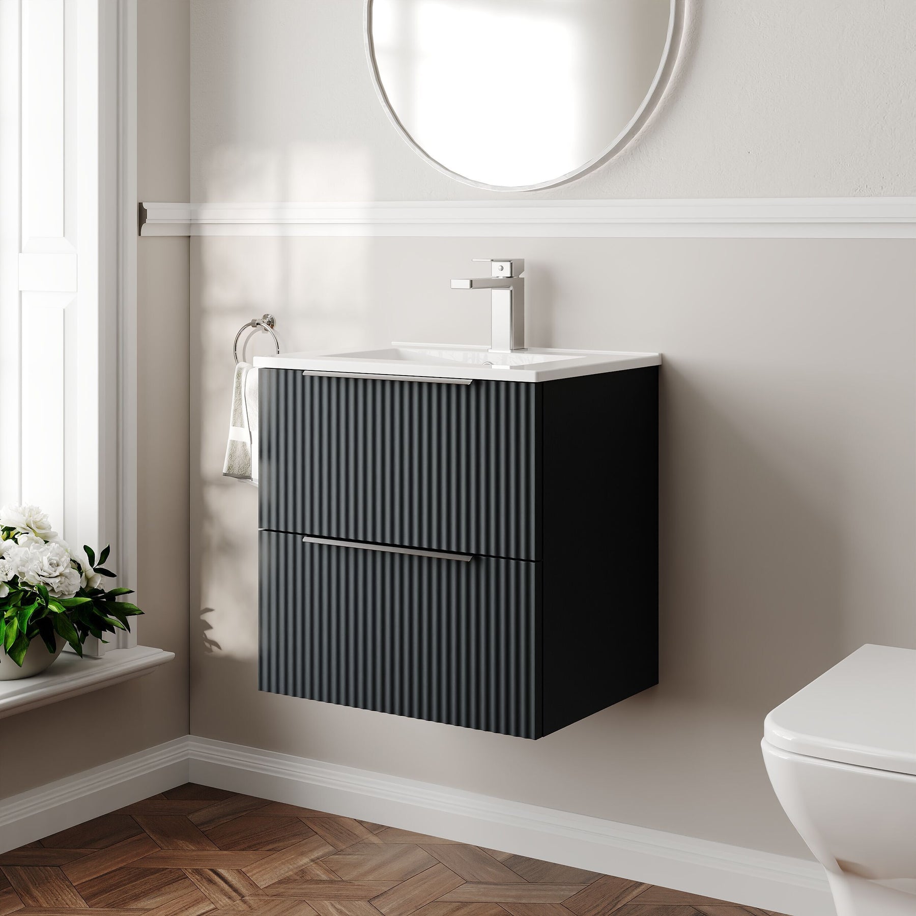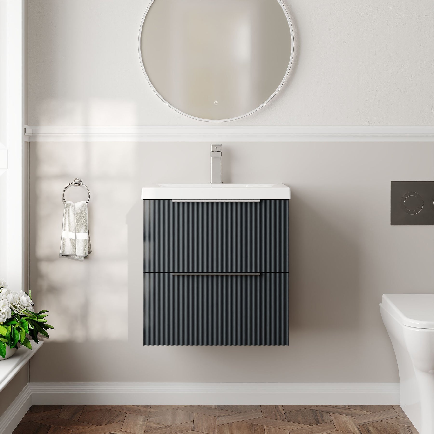 The Hudson Reed Fluted bathroom furniture collection features an on-trend fluted front and a choice of popular colours. The stylish Fluted vanity units and matching furniture include modern chrome handles that can be changed to alternative matt black or brushed brass handles.