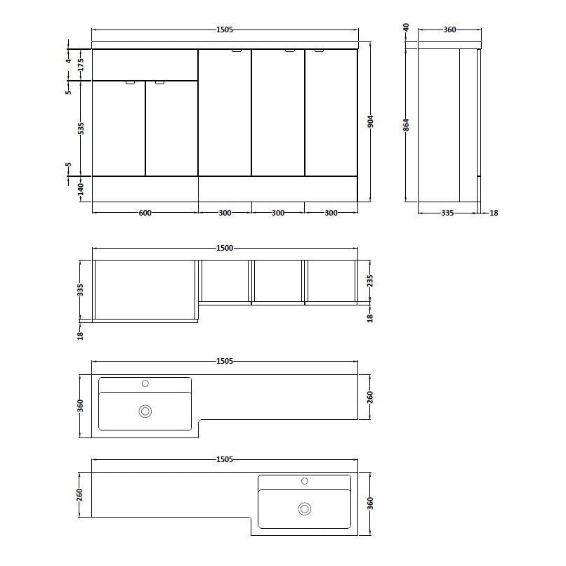 Hudson Reed Fusion combination units are the perfect way to introduce practical storage and a clean modern style into your bathroom. The unit has an overall depth of 360mm, making it a great option for family bathrooms. The 1500mm combination unit includes a 600mm vanity unit, 3 x 300mm storage base units, a modern polymarble L-shaped basin (available left or right hand) and a plinth for completing the installation.