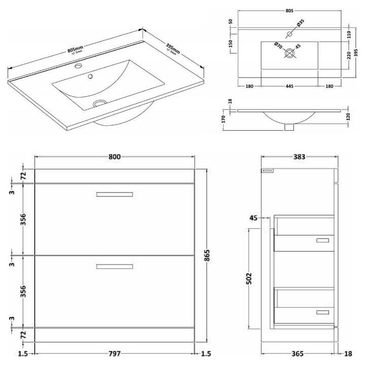 Cape 800mm Floor Standing 2 Drawer Vanity Unit & Minimalist Basin - Anthracite Woodgrain