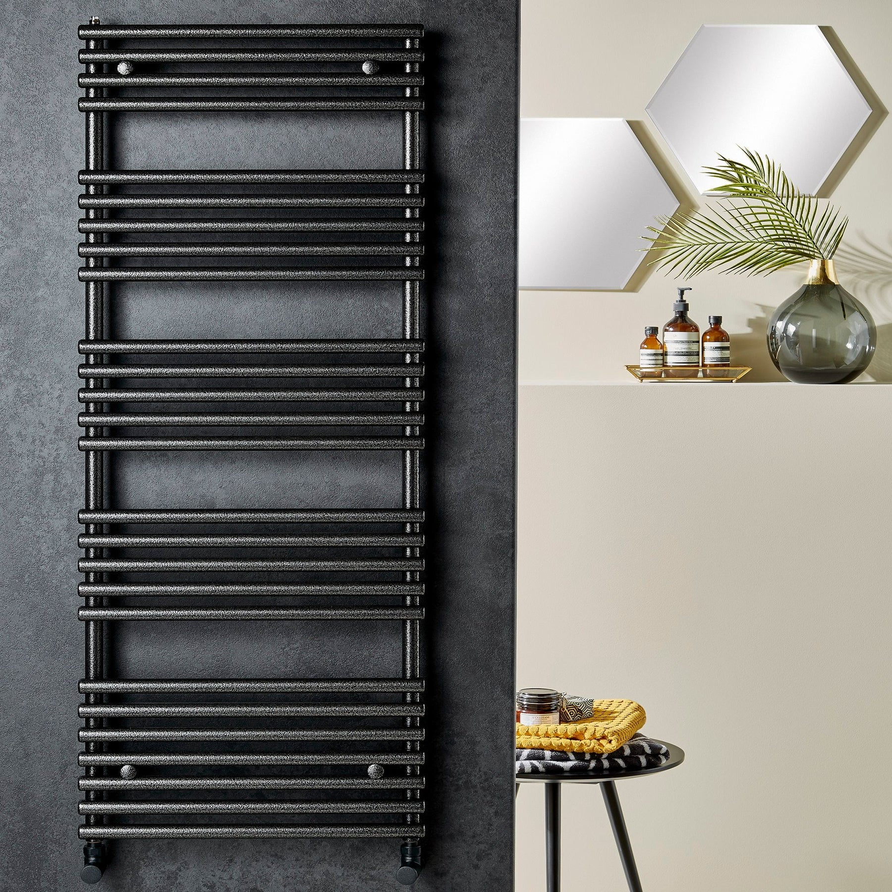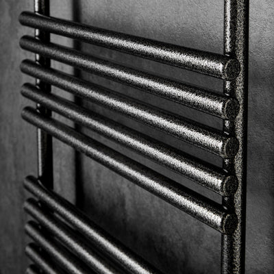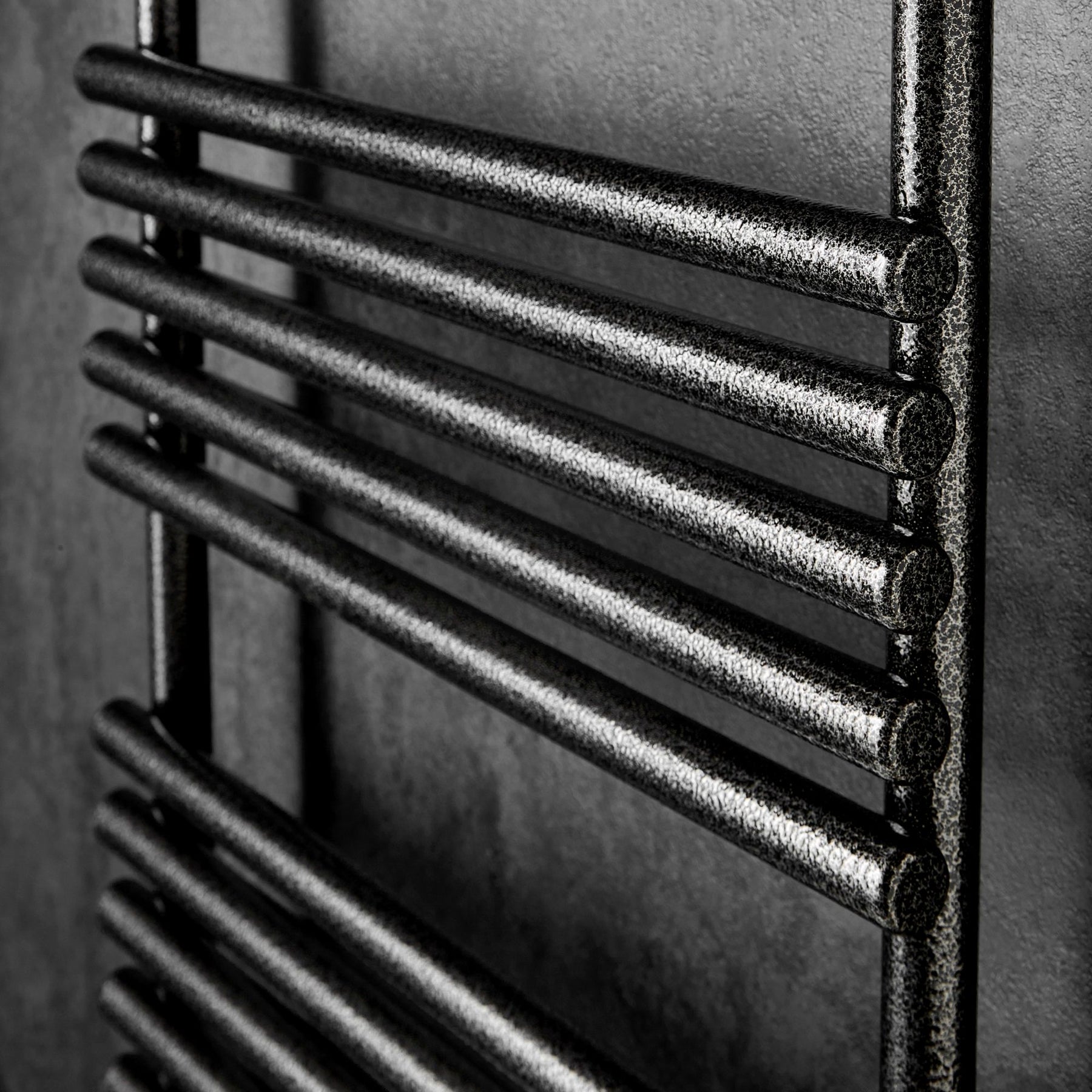 The Lana Hammered Black Silver towel rail radiator has a luxurious textured gloss hammered silver and black finish and features a contemporary "tube-on-tube" ladder design. The towel rail features large gaps for towels and the tubes are nicely rounded. The towel rail is available in a range of sizes to suit the space you have available each with an excellent heat output level (varying dependent on size, see size information below).