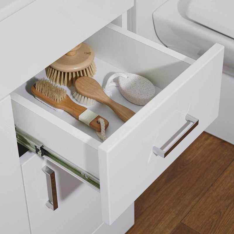 With simple straight lines and a clean gloss white finish, the Lomond floor standing vanity unit is a great option for busy family bathrooms. The overall projection of 390mm provides a generous space for washing and with three soft close doors and two soft close drawers, the unit will provide lots of extra storage space for toiletries. The rectangular style of the unit is finished with angular chrome handles, but you can change these over for other coloured handles if desired. The Lomond floor standing unit is easy to install and will cover any unsightly pipes you have coming up from the floor (where possible).