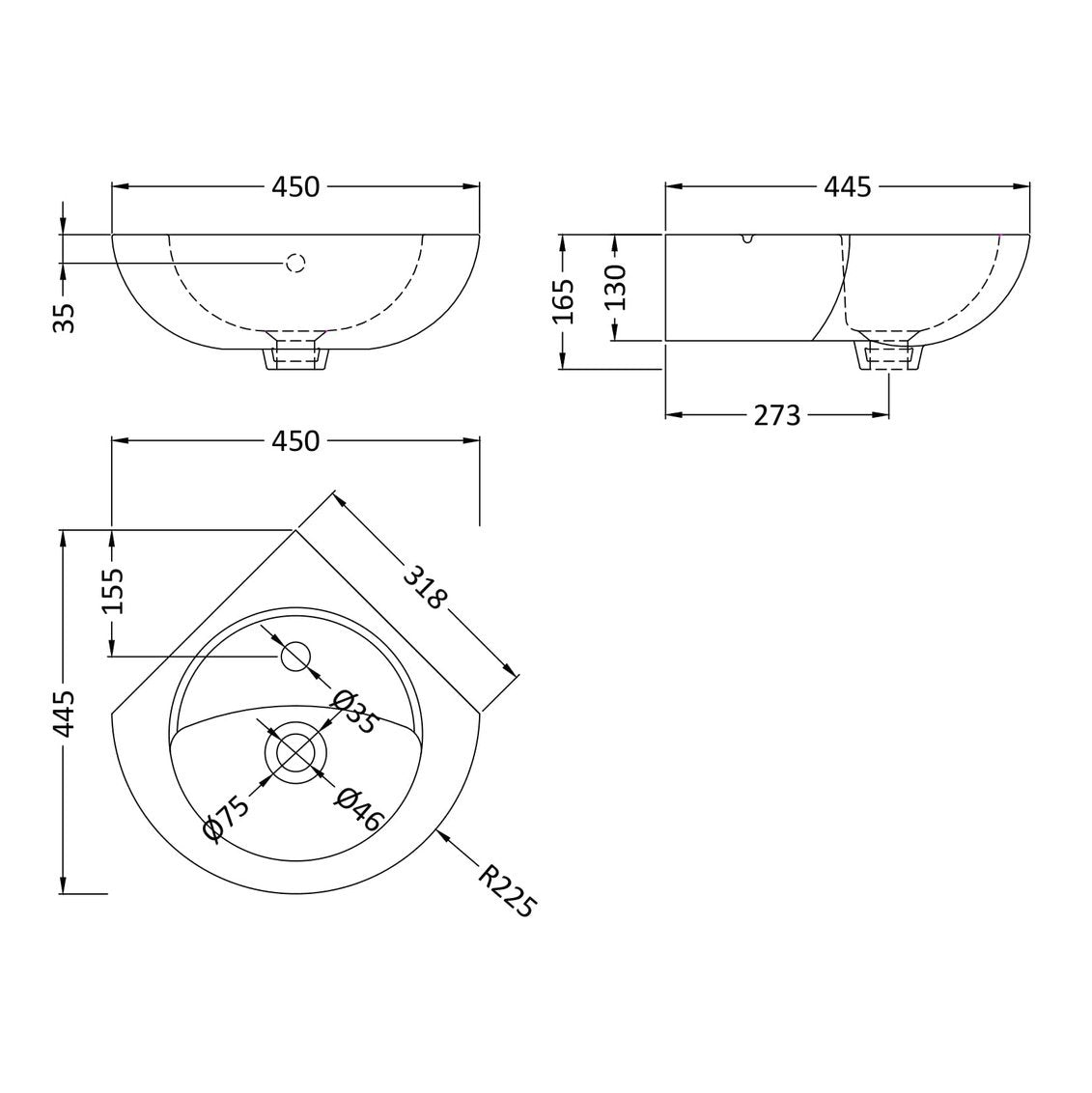 Nuie Melbourne Corner Wall Hung Basin 450 x 445mm