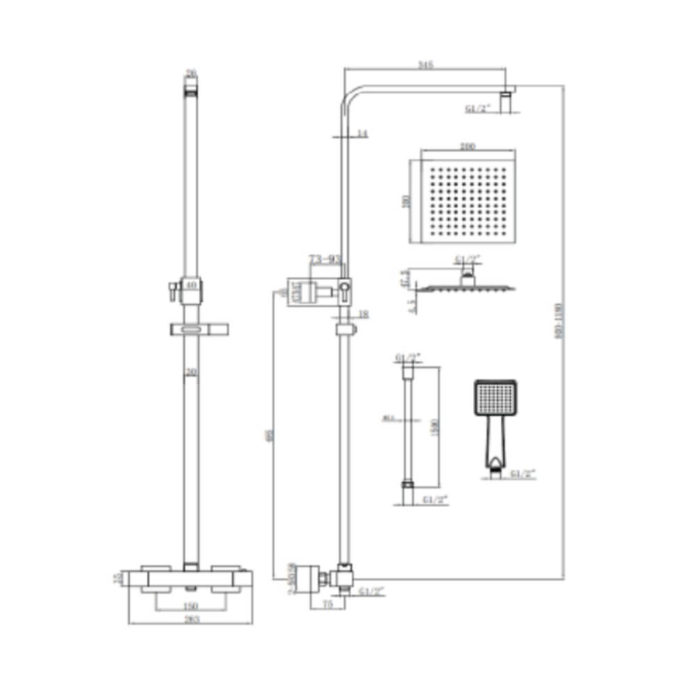 - With exposed thermostatic shower valve, ultra slim 200mm drencher overhead shower, height-adjustable riser rail with handset and smooth shower hose