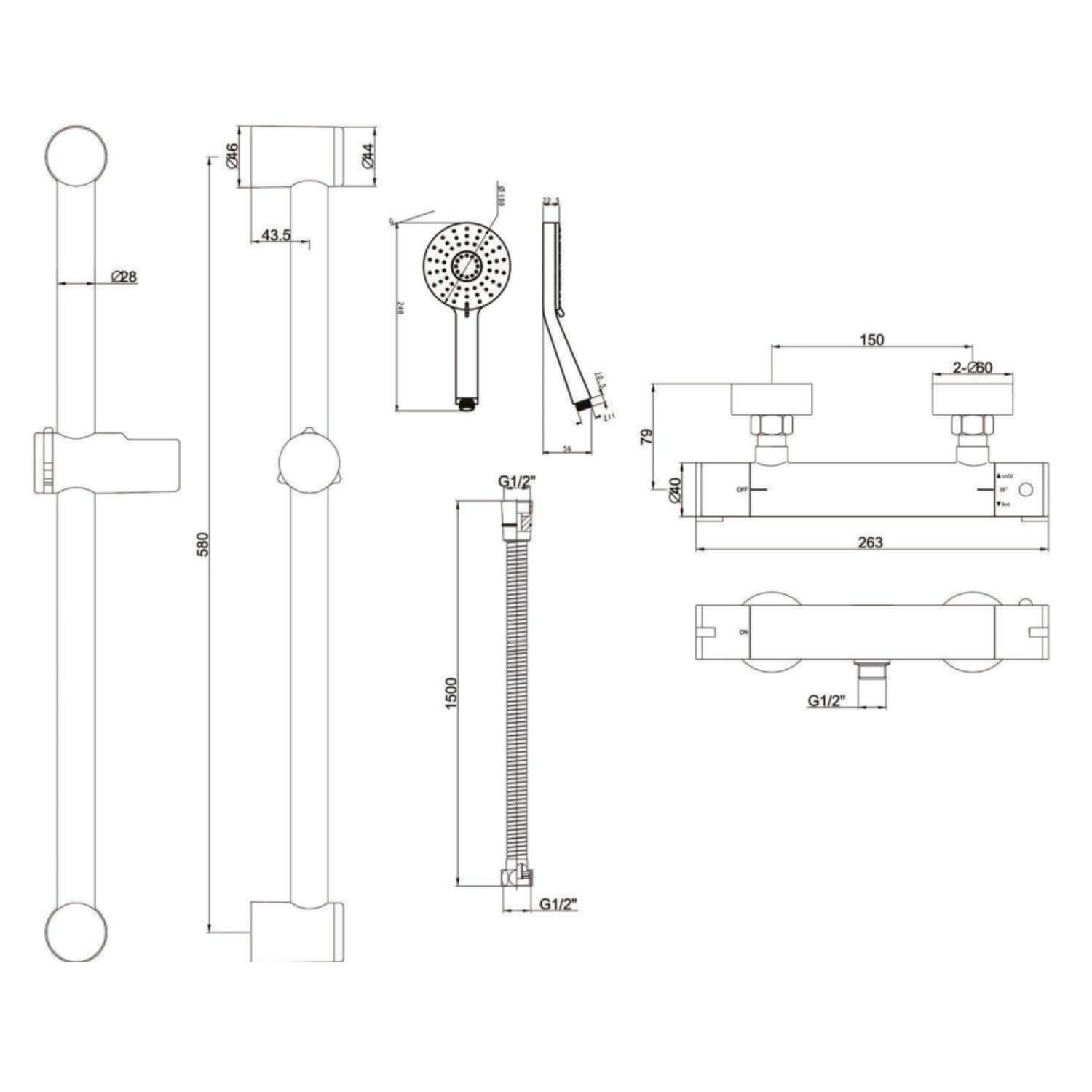 - With exposed thermostatic shower valve, height-adjustable riser rail with handset, shower hose and Easyfit brackets